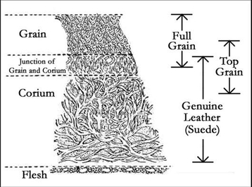 Если срезать «full grain» и слой «genuine» – останется нижний слои кожи - «Splitted» (спилок), шершавый с обеих сторон. Без финиша его часто выдают за замшу. Концентрация коллагенов здесь уже в разы меньше, поэтому и сильно ниже плотность и прочность. Но и его можно привести в порядок – нужно наклеить виниловое покрытие, а потом, на специальном прессе, напечатать рисунок кожи. В некоторых странах этот верхний виниловый слой не должен быть толще 0,15мм, иначе материал уже нельзя называть кожей. В нашей стране правила мягче, и в магазинах полно красивой «пластиковой» кожи, лицо которой трескается в местах сгиба.