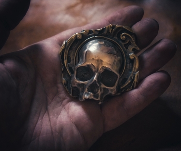 Состоит она из двух частей — череп из нейзильбера, впечатанный в латунное основание, напоминающее осколок архитектурного фрагмента той эпохи. Напоминает нам, что все материальное бренно и имеет свой срок..