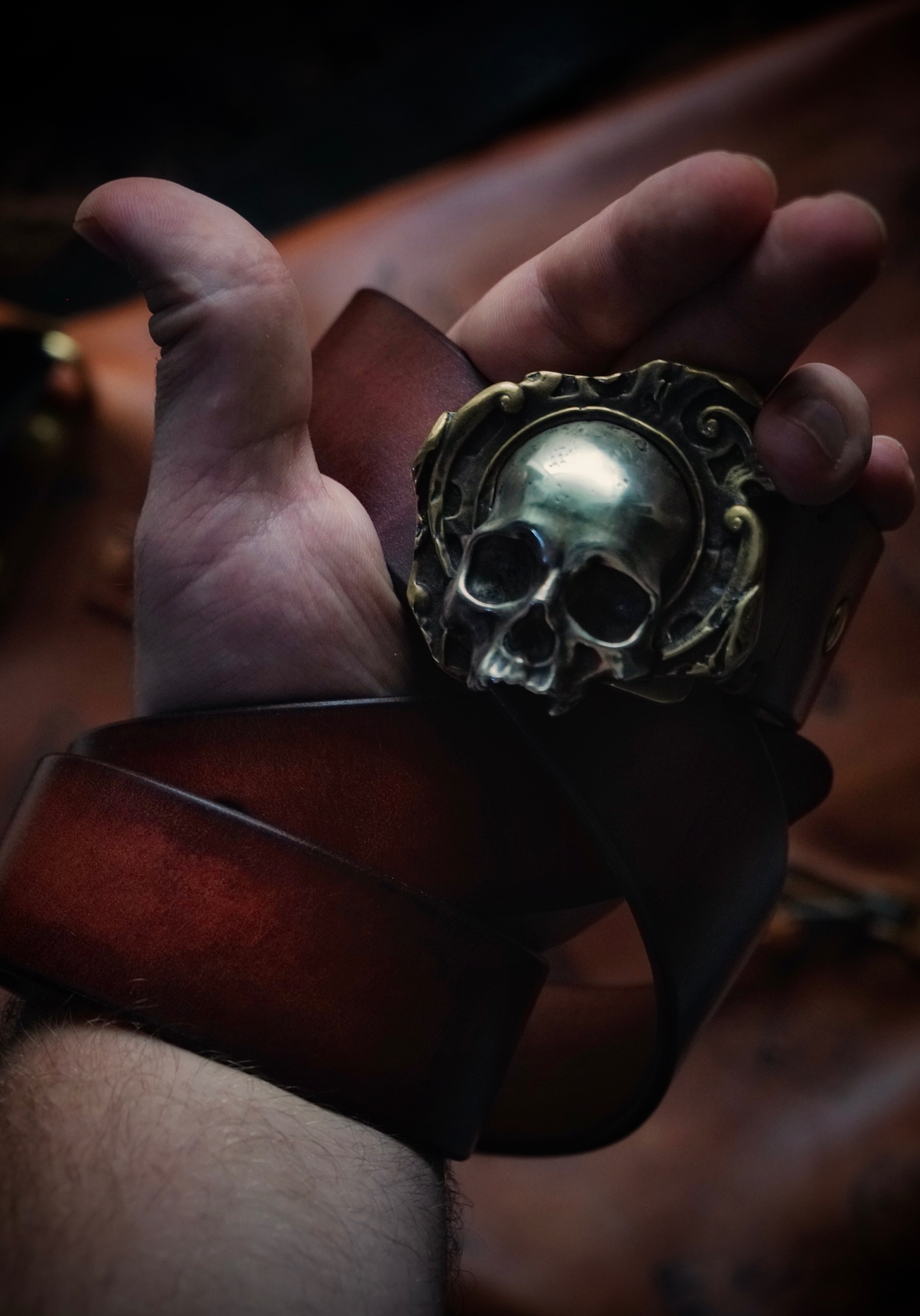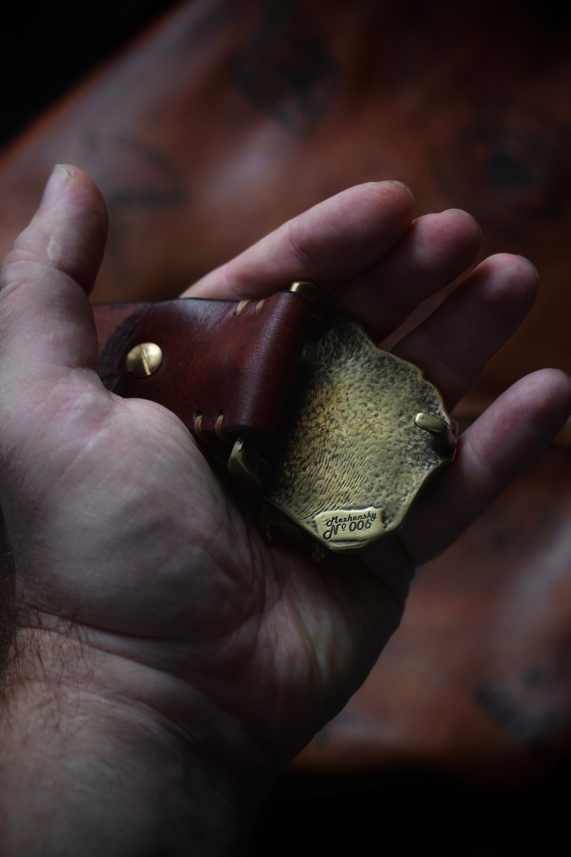 Тяжелая волгоградская бычина с авторским окрасом и вощением, оружейная латунь и нейзильбер — гремучая смесь для брутального ремня.